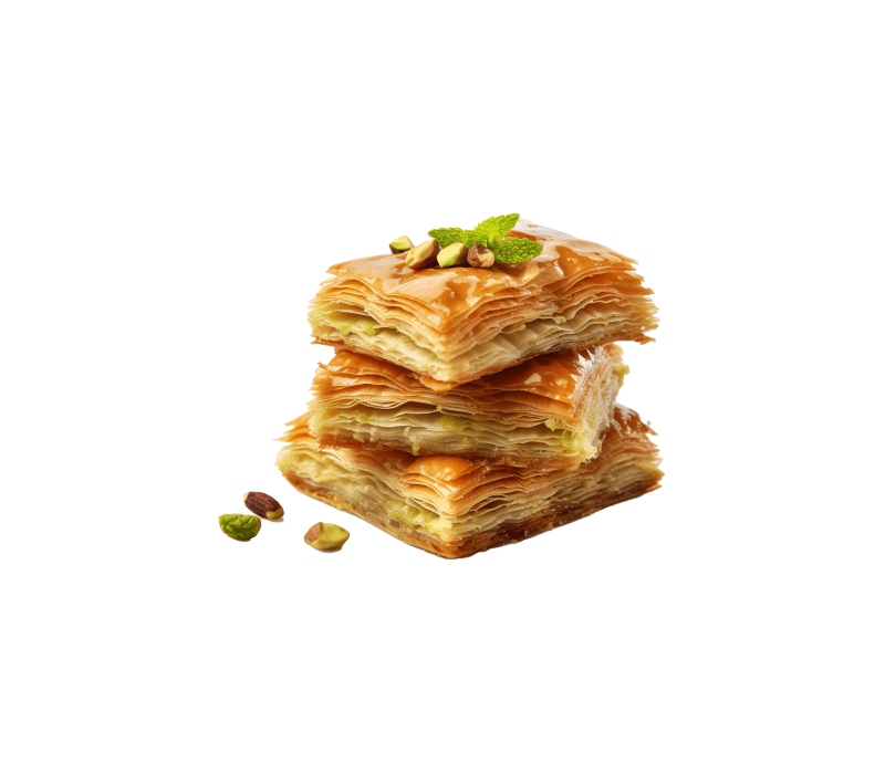 Baklava orzechowa to deser z cienkiego ciasta filo, wypełniony mieszanką orzechów (np. włoskich, pistacji) i cynamonu. Po upieczeniu nasącza się go słodkim syropem z miodu i wody różanej. Chrupiąca, słodka i pełna aromatycznych smaków, idealna na deser lub przekąskę.