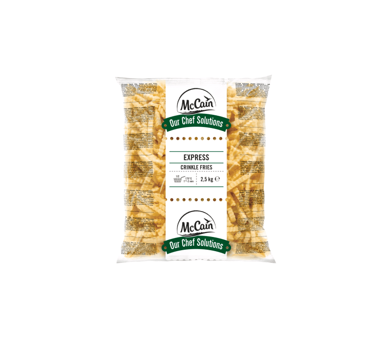 Frytki Express Crinkle to karbowane, podsmażone i głęboko mrożone frytki, które zapewniają wyjątkową chrupkość, idealne do szybkiego przygotowania i precyzyjnego kontrolowania porcji.